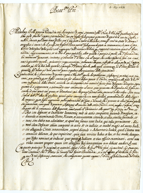 Maddalena Belli chiede al pontefice che suo figlio Pietro venga assolto dalle ingiuste accuse