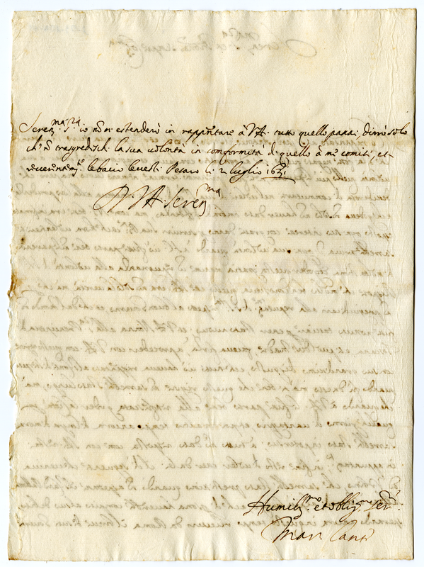Il marchese Lanti riferisce a Livia Della Rovere, duchessa di Urbino, di aver manifestato al cardinale Barberini la sua contrarietà per averle negato il viaggio a Firenze.