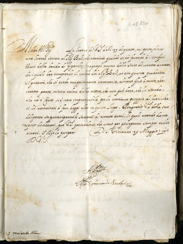 Lettera del cardinale Barberini Antonio senior a Malatesta Albani (1643 maggio 29)