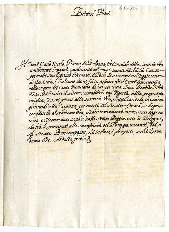 Il conte Carlo Nicola Piatesi chiede al pontefice di ottenere la carica di Senatore del Reggimento di Bologna