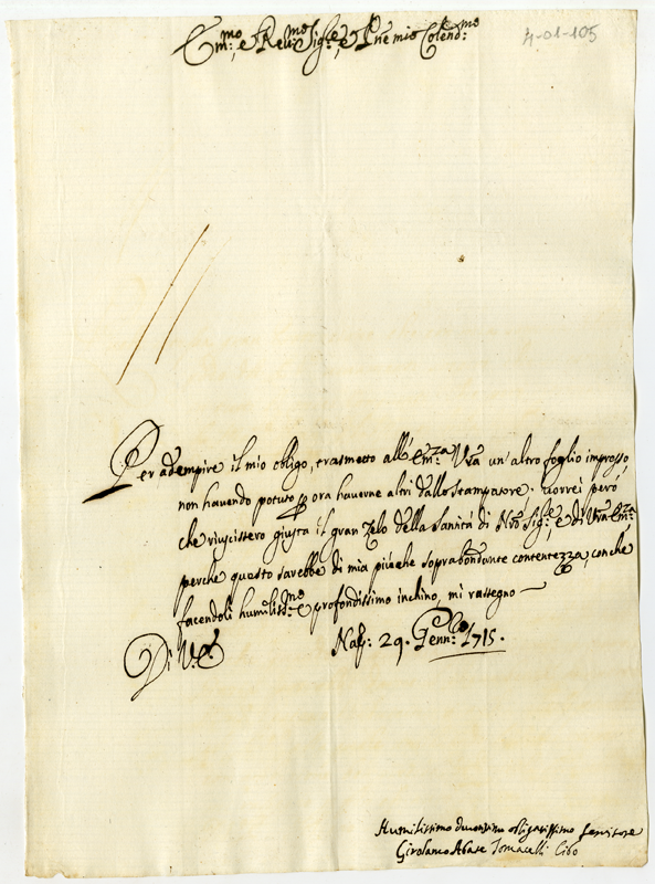 Lettera di Girolamo Tomacelli Cibo al Cardinale Annibale Albani (1715 gennaio 29)