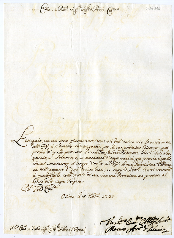 Lettera di Macario arcivescovo di Seleucia al cardinale Annibale Albani (1720 dicembre 13)