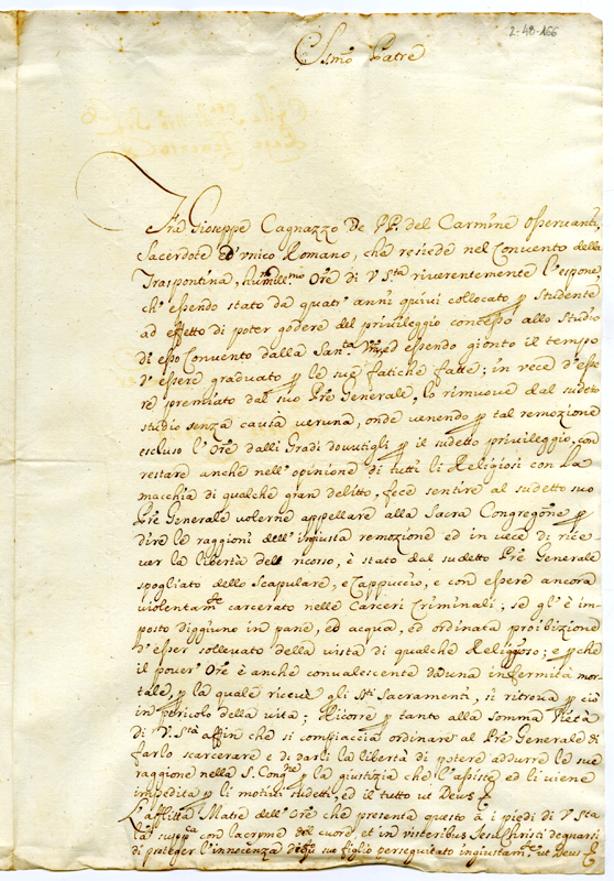Lettera di fra Giuseppe Cagnazzo carmelitano osservante a papa Clemente XI (1700-1721)