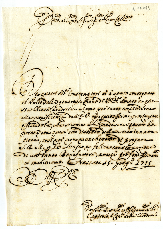 Lettera del Capitolo e Canonici della cattedrale di Frascati (1715 giugno 15)