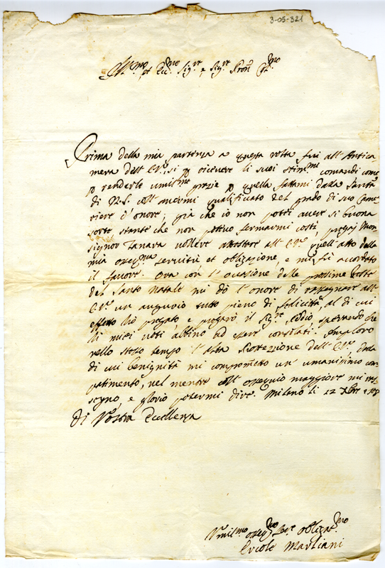 Lettera di Ercole Marliani ad Annibale Albani (1708 dicembre 12)