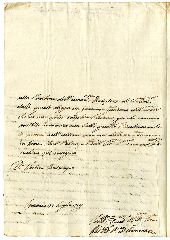 Lettera di Alessandro vescovo di Cremona a un cardinale (1718 luglio 21)