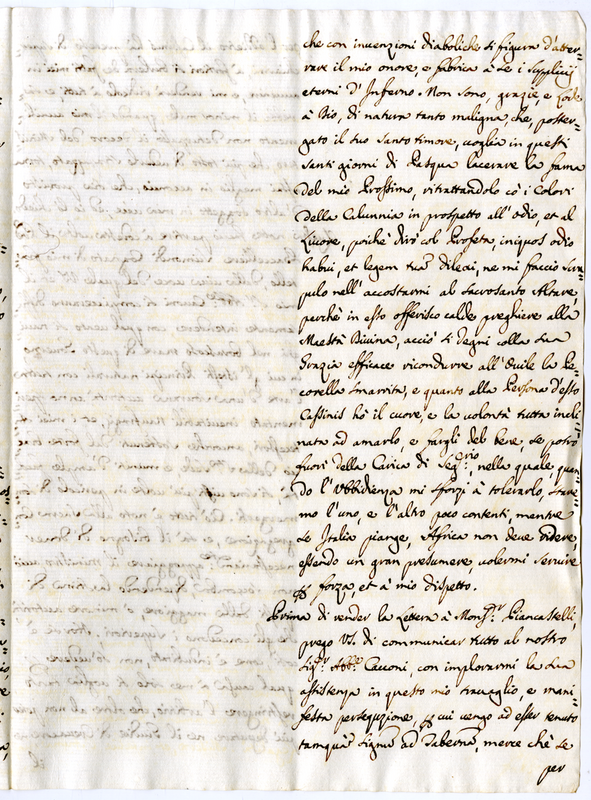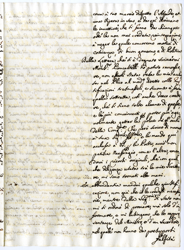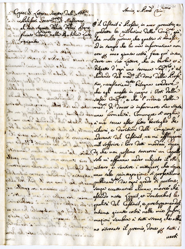 Copia di lettera scritta dall'abbate Paliferi governatore di Messerano al suo agente Felice Felici beneficiato coadiutore nella basilica Lateranense (1718 aprile 18)