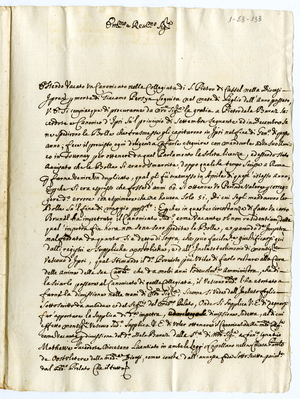 Supplicano il Cardinale di concedere a Francesco Ignazio Mathewe il canonicato nella collegiata di San Pietro di Cassel vacante per morte di Giocomo Persyn