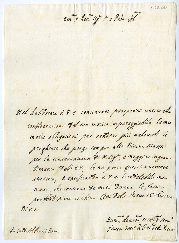 Lettera di Fausto vescovo di Città della Pieve al cardinale Annibale Albani (1714 dicembre 16)