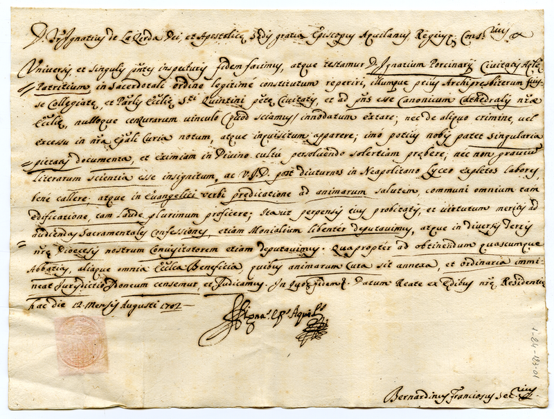 Attestato sullo stato ecclesiale culturale e morale rilasciato da Ignazio de la Qerda Vescovo dell'Aquila a favore di Ignazio Porcinari (1702 agosto 12)