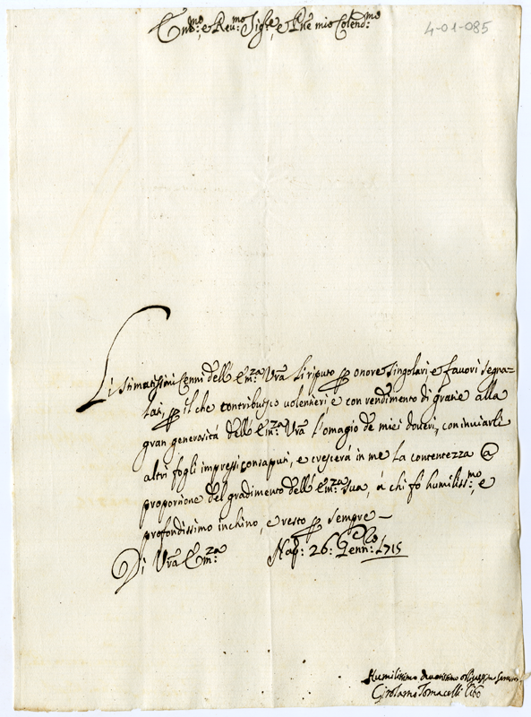 Lettera di Girolamo Tomacelli Cibo al Cardinale Annibale Albani (1715 gennaio 26)