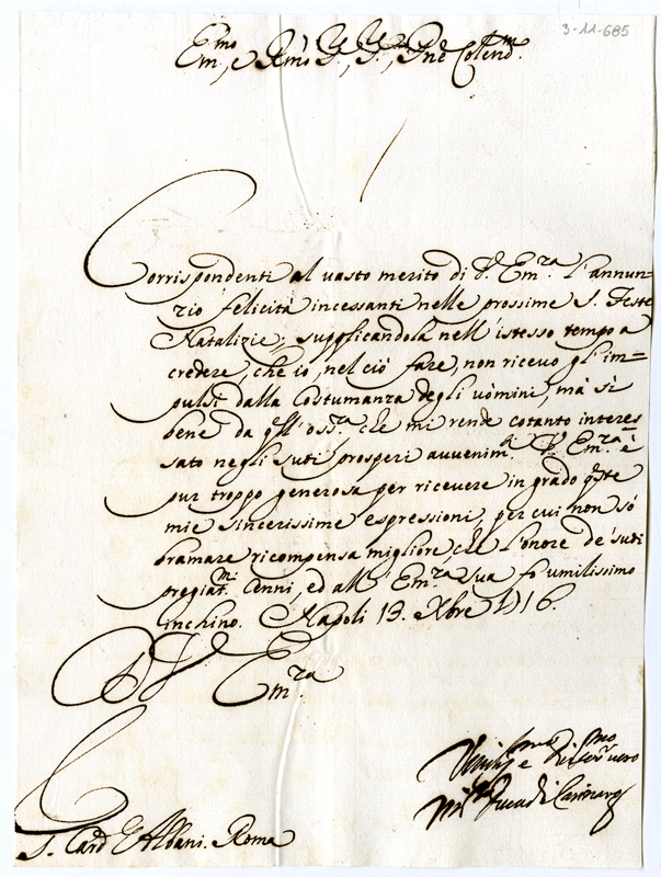 Lettera del duca di Carinaro al cardinale Annibale Albani (1716 dicembre 13)