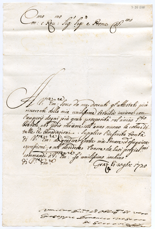 Lettera di Giuseppe Domenico vescovo al cardinale Annibale Albani (1720 novembre 30)