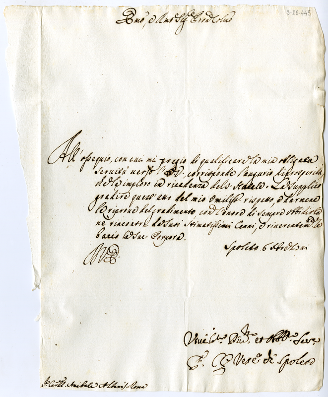 Lettera di Carlo Giacinto vescovo di Spoleto al cardinale Annibale Albani (1721 dicembre 6)