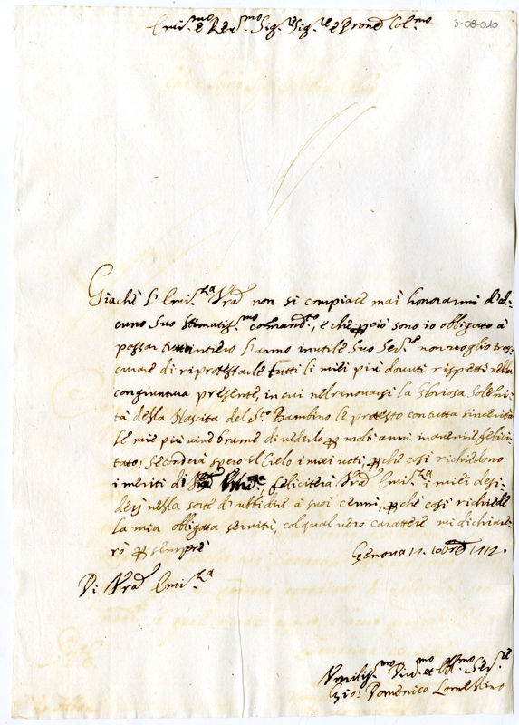 Lettera di Giovanni Domenico Lomellino al cardinale Annibale Albani (1712 dicembre 17)
