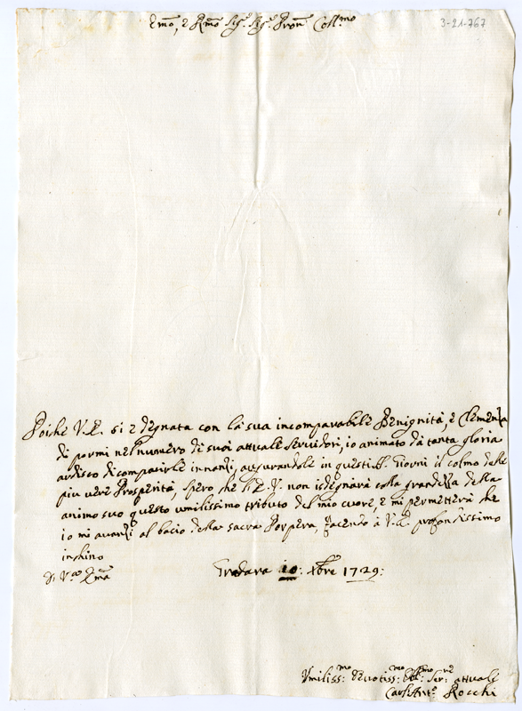 Lettera di Carlo Antonio Rocchi al cardinale Annibale Albani (1729 dicembre 10)