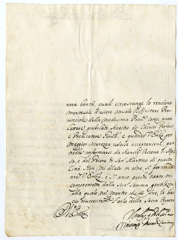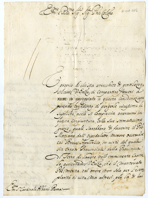 Chiede la protezione del cardinale per elevare a Provinciale della Terra di Lavoro il padre Mariano dell'Ospitaletto