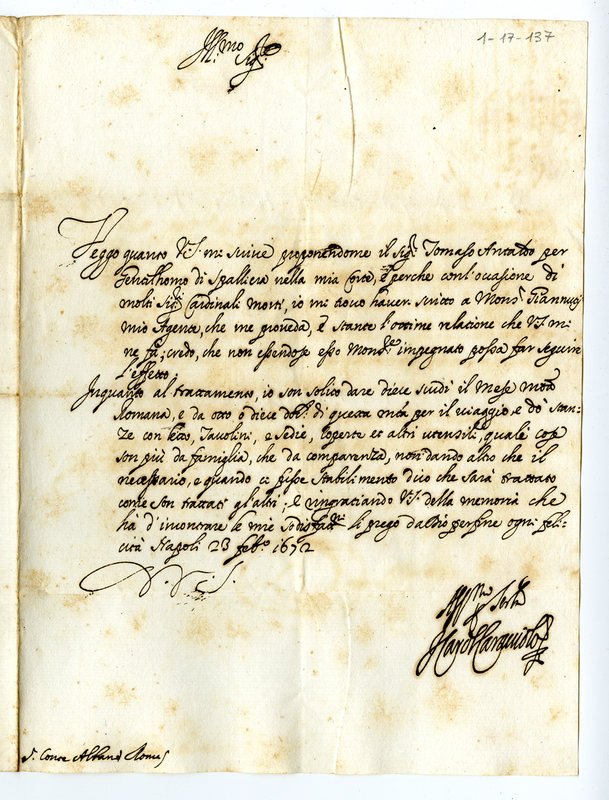 Lettera del cardinale Innico Caracciolo a Carlo Albani (1672 febbraio 23)