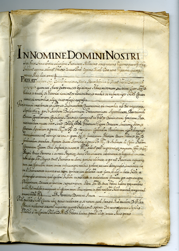 Instrumento scritto in forma autentica contenente la concordia tra la Santa Sede, il Duca di Urbino e la casa dei Gran Duchi di Toscana stipulata il 24 maggio 1624