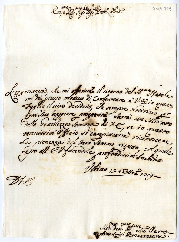 Lettera di Zerbino Luigi Bonaventura ad Annibale Albani (1719 dicembre 15)