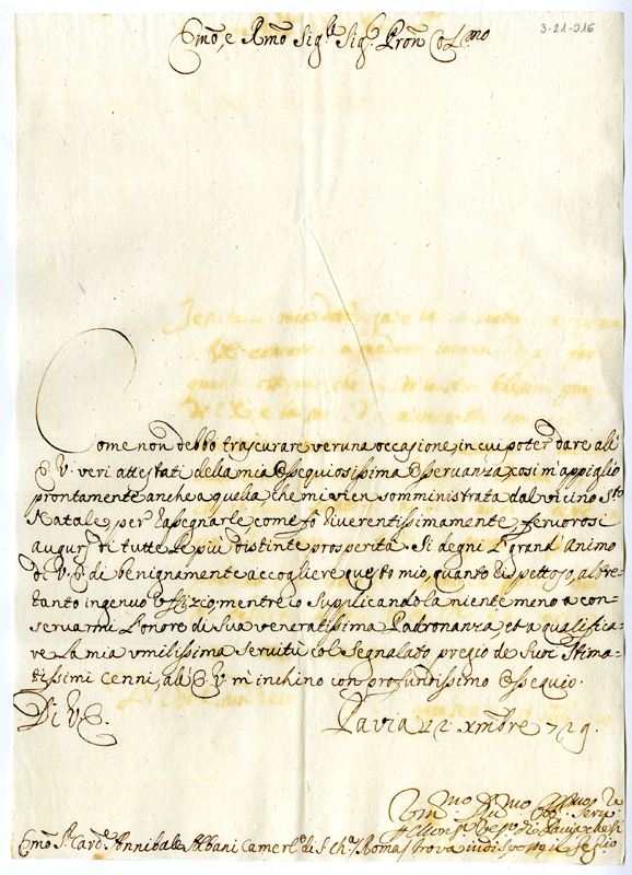 Lettera per monsignor tesoriere di Pavia che si trova indisposto, il figlio al cardinale Annibale Albani (1729 dicembre 12)