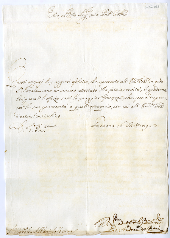Lettera di Giovanni Andrea de Mari al cardinale Annibale Albani (1719 dicembre 16)