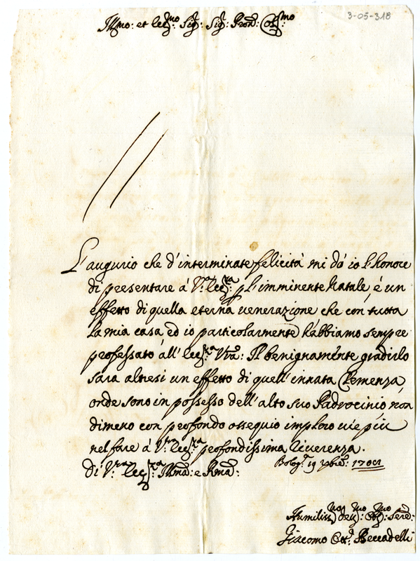 Lettera di Giacomo Ottavio Beccadelli ad Annibale Albani (1708 dicembre 19)