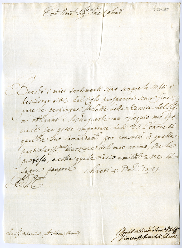 Lettera di Vincenzo arcivescovo di Chieti al cardinale Annibale Albani (1721 dicembre 4)