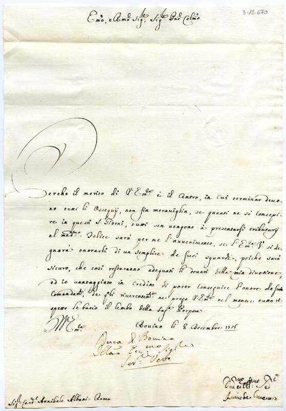 Lettera di Inigo de Guevara al cardinale Annibale Albani (1725 dicembre 8)