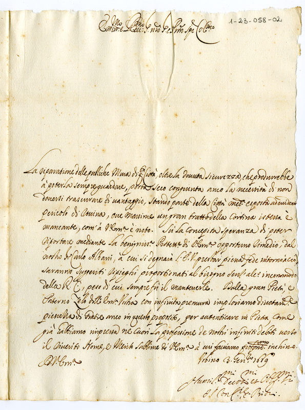 Lettera del gonfaloniere e priori al cardinale Rasponi legato di Urbino (1669 gennaio 3)