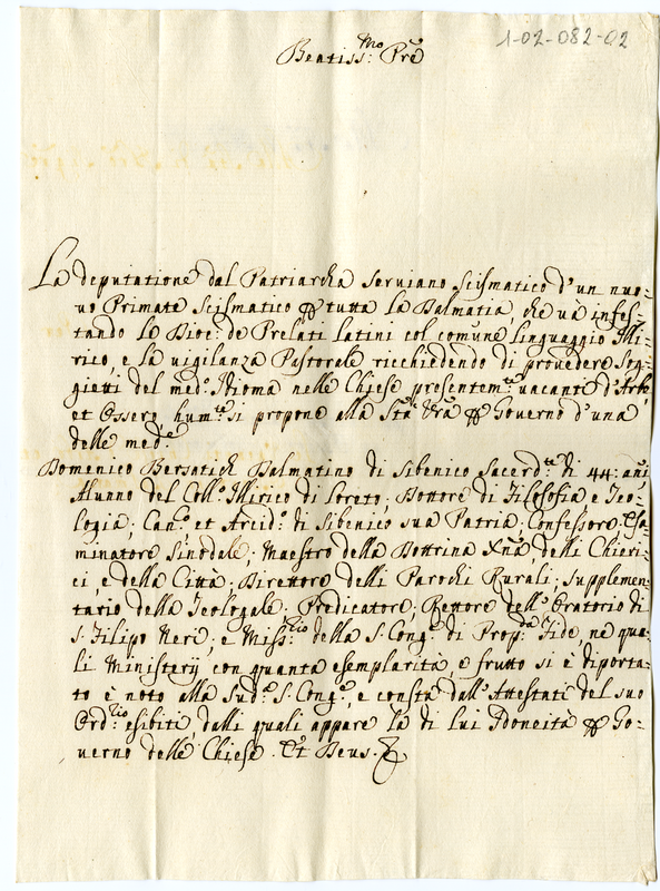 Si propone a Papa Clemente XI la nomina di Domenico Bersatich di Sebenico alla chiesa di Ossero o a quella di Arbe.