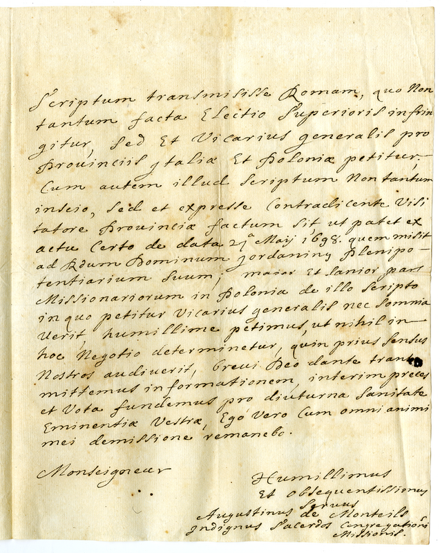 Lettera di padre Agostino al Cardinale Albani (1698 aprile 9)