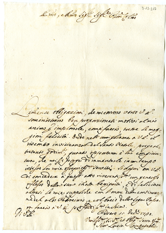 Lettera di Lucia Campagnoli al cardinale Annibale Albani (1730 dicembre 11)