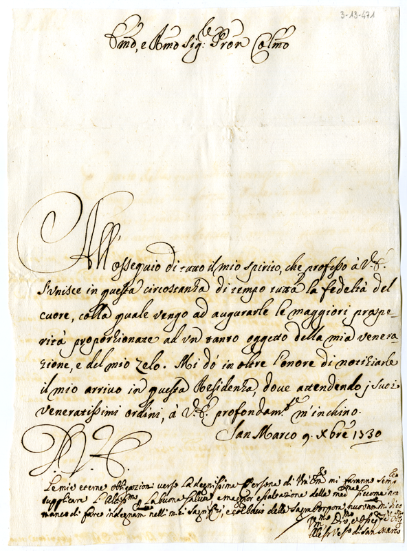 Lettera di Alessandro vescovo di San Marco al cardinale Annibale Albani (1730 dicembre 9)