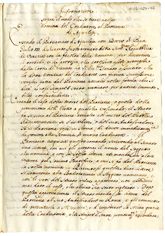 Informazione sopra il modo che si tiene nella nomina del coadjutore al Patriarca di Aquileia