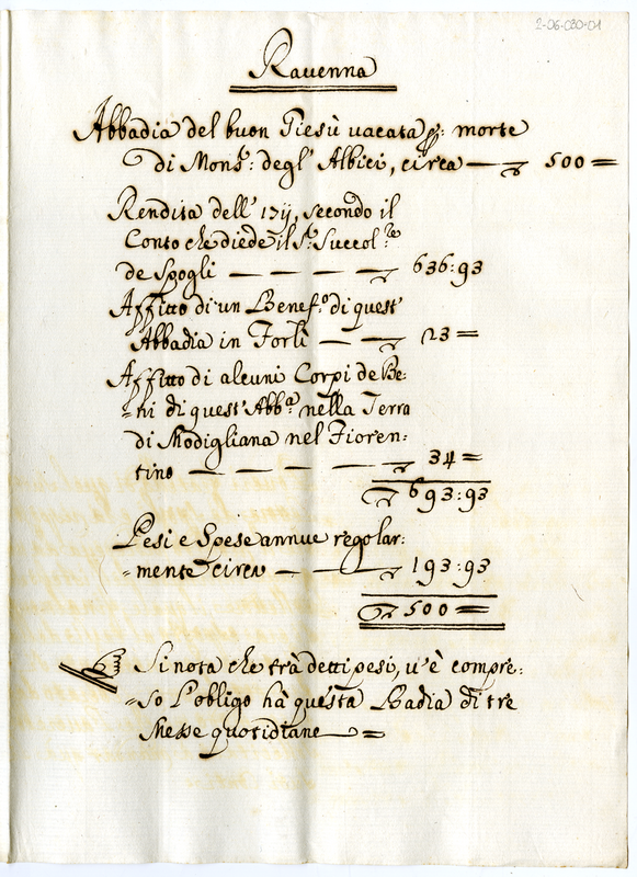 | bo.correlazioni | Allegato a: Lettera di trasmissione del Cardinale Patrizi a Papa Clemente XI circa la vacante rendita della Badia del Buon Gesù di Ravenna (1710-1721) | |
