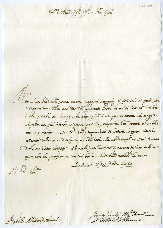 Lettera di Adeodato vescovo di San Severo al cardinale Annibale Albani (1720 dicembre 14)