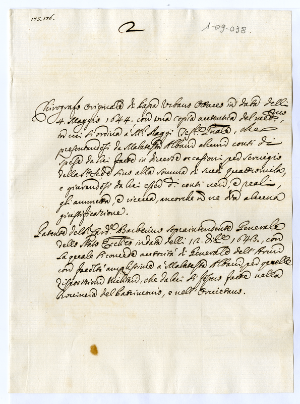 Chirografo originale di Papa Urbano Ottavo in data delli 4 maggio 1644, con una copia autentica del medesimo, in cui si ordina à Monsignor Raggi Tesoriere Generale, che presentandosi da Malatesta Albani alcuni conti di spese da lui fatte in diverse occasioni per servigio della Santa Sede sino alla somma di scudi quattromila, e giurandosi da lui esser di conti neri, e reali gli ammetta, e riceva, ancorche non ne dia alcuna giustificazione. Patente del Cardinale Barberino Soprintendente Generale dello Stato Ecclesiastico in data delli 12 dicembre 1643, con la quale si concede autorità di Generale dell'Armi con facoltà amplissime à Malatesta Albani, per quelle disposizioni Militari, che da lui si fossero fatte nella Provincia del Patrimonio, e nell'Orvietano