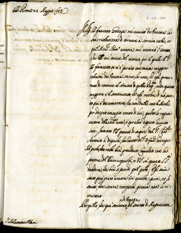 Lettera del cardinale Barberini Francesco senior a Malatesta Albani (1643 maggio 22)