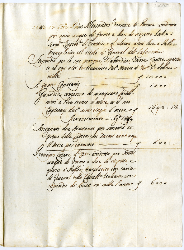 Nota in data 1682 17 novembre sul Principe Alessandro Farnese quale Ufficiale della Serenissima Repubblica di Venezia e suoi dipendenti