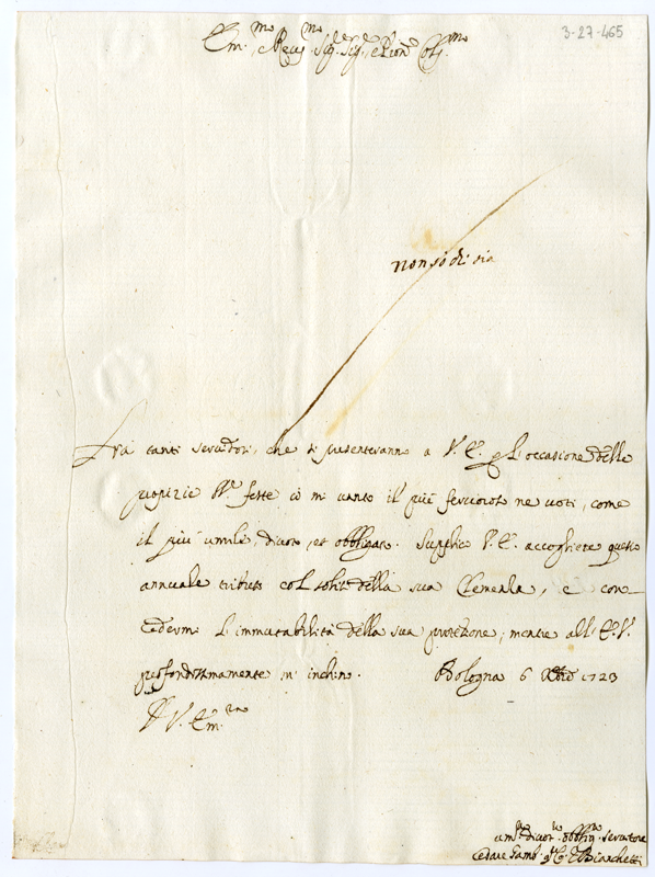 Lettera di Cesare Gambalunga Bianchetti al cardinale Annibale Albani (1723 dicembre 6)
