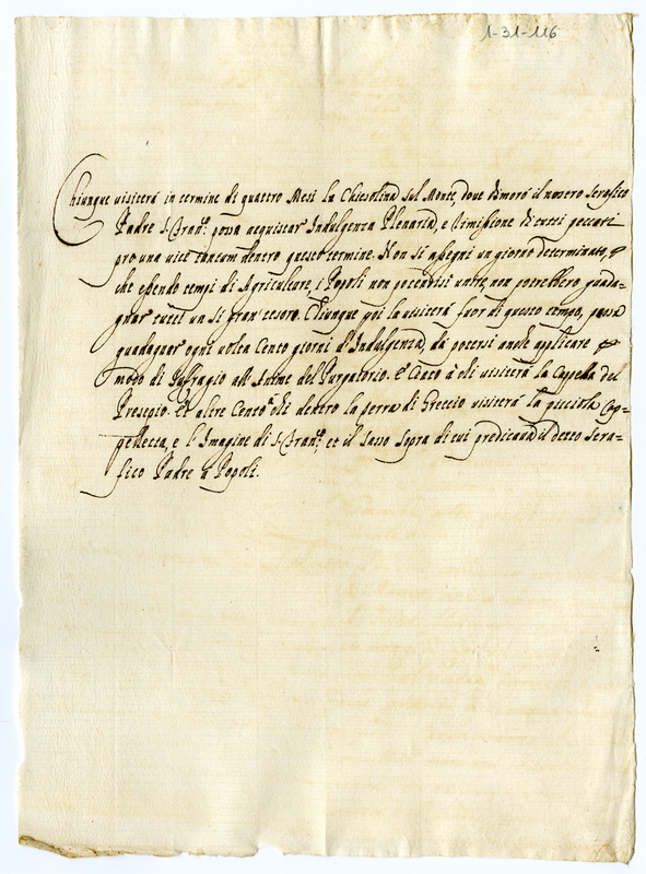 Assegnazione di indulgenza plenaria a chiunque visiterà la Chiesolina del Monte (1700-1721)