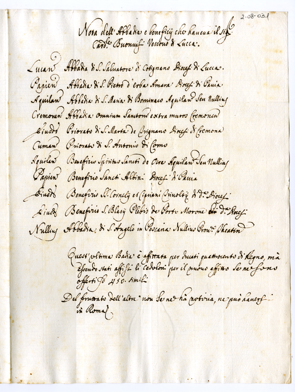 Nota dell'Abbadie e benefitii che haveva il Signor Cardinale Buonvisi Vescovo di Lucca (1700)