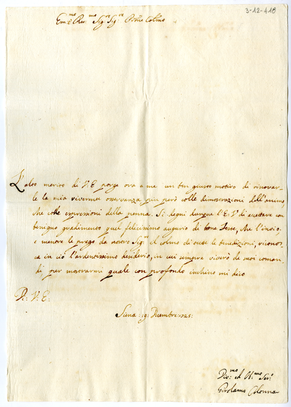 Lettera di Girolamo Colonna al cardinale Annibale Albani (1725 dicembre 19)