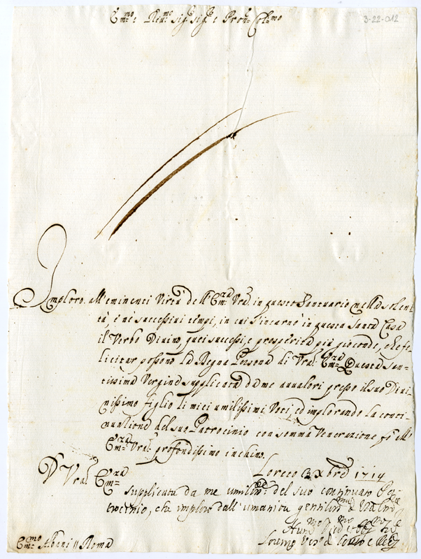 Letterra di Lorenzo vescovo di Loreto e Racanati al cardinale Annibale Albani (1714 dicembre 3)
