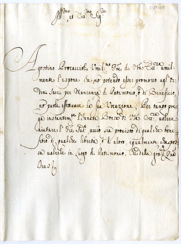Non potendo essere consacrato agli ordini sacri per mancanza di patrimonio, chiede di poter essere provvisto di qualche beneficio