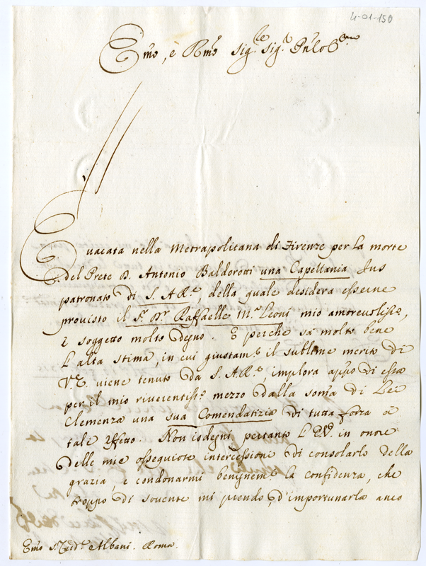 Lettera di Alessandro Pepoli al Cardinale Annibale Albani (1715 febbraio 16)