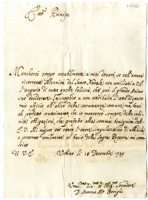 Lettera di don Antonio Maria Arrighi al cardinale Annibale Albani (1730 dicembre 18)