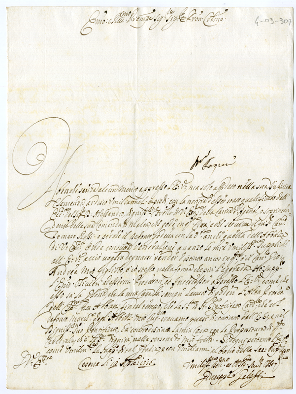 Lettera di Giuseppe Galeffi al Cardinale Annibale Albani (1716 aprile 12)