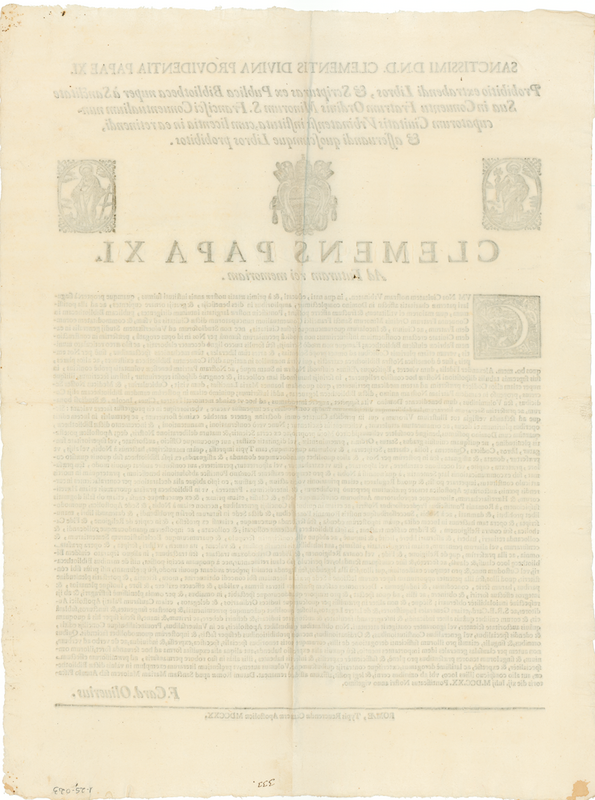 Proibizione di sottrarre libri e scritture dalla pubblica biblioteca fondata da Clemente XI nel Convento dei frati dell'0rdine dei Minori Conventuali in Urbino e licenza di mantenere e custodire tutti i libri proibiti